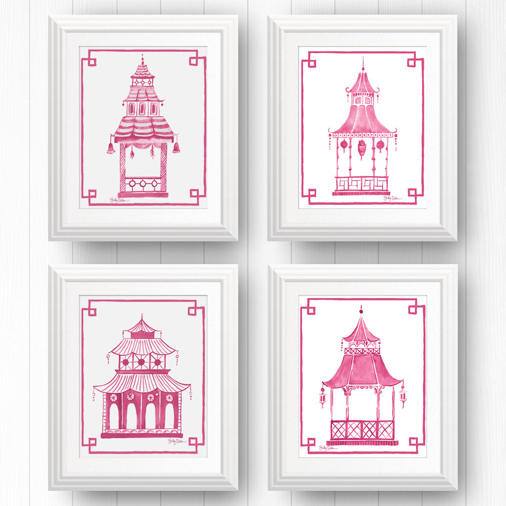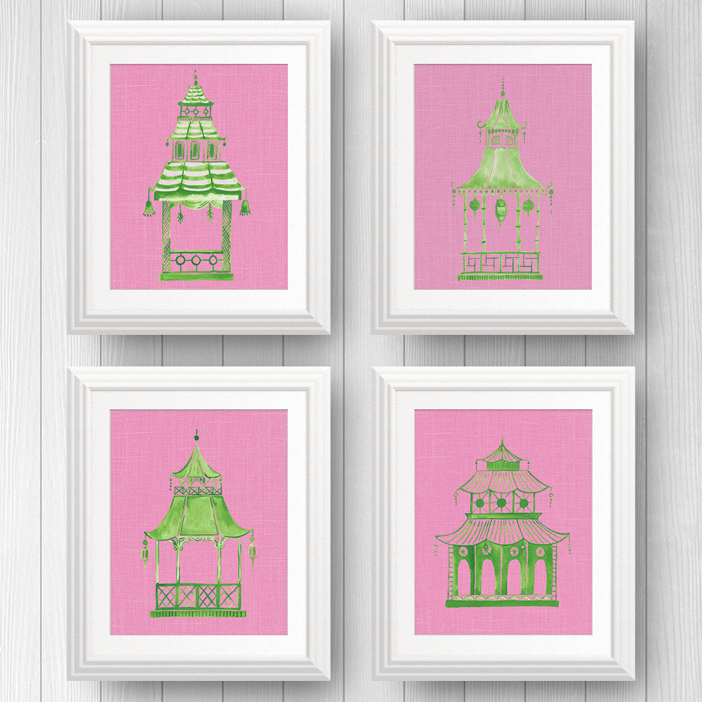 Bring home a colorful, modern take on elegant old-world Chinoiserie. This set of four hand-painted pink pagoda prints on green background will lend chic sophistication...