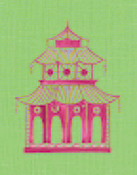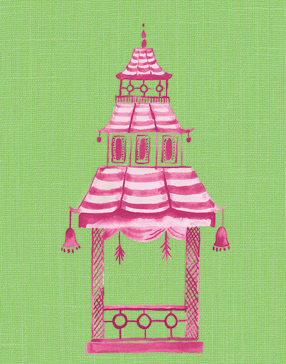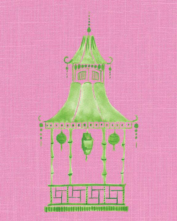 Bring home a colorful, modern take on elegant old-world Chinoiserie. This hand-painted pink pagoda print on green background will lend chic sophistication to any home....