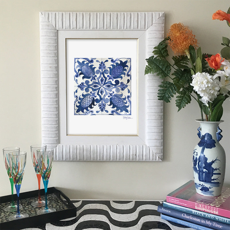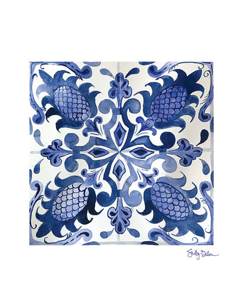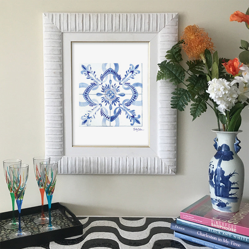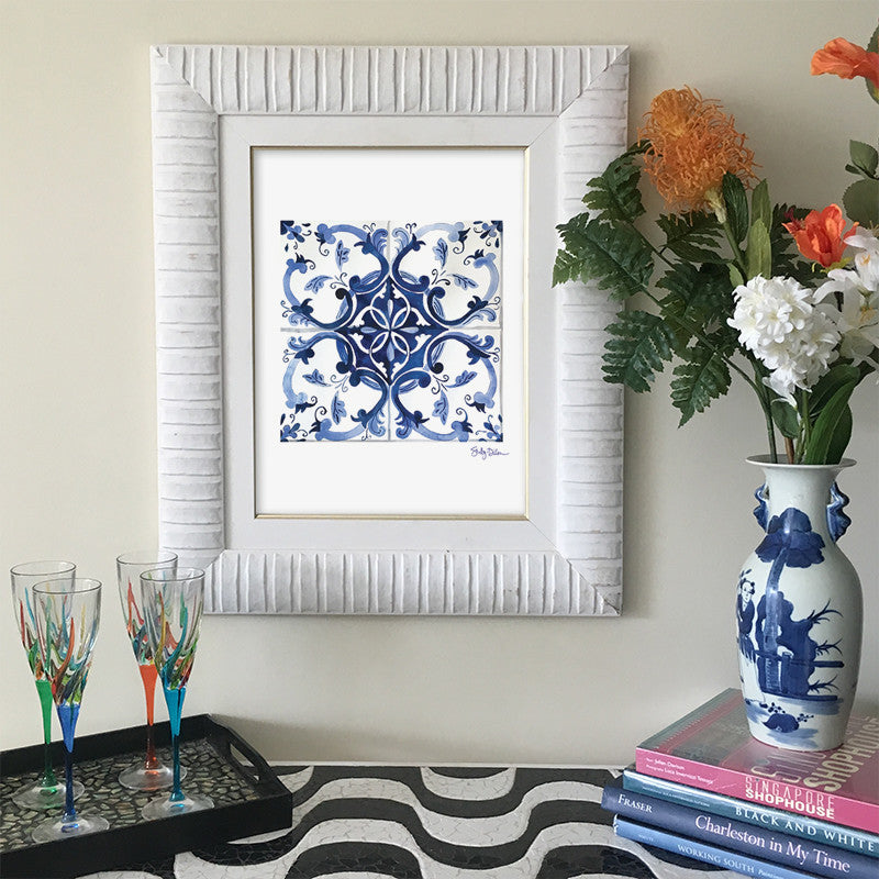 A Mediterranean inspired beautiful blue and white tile art print by Shelby Dillon Studio. Mediterannean Azulejo tiles like these can be seen throughout the Mediterranean, scattered...