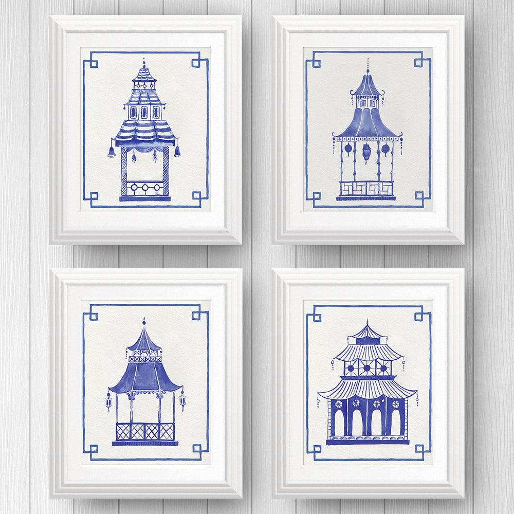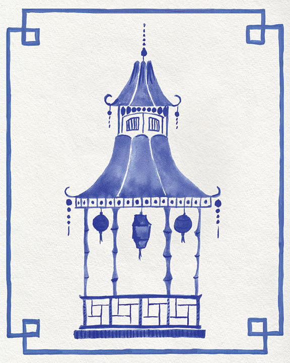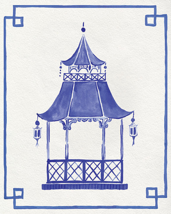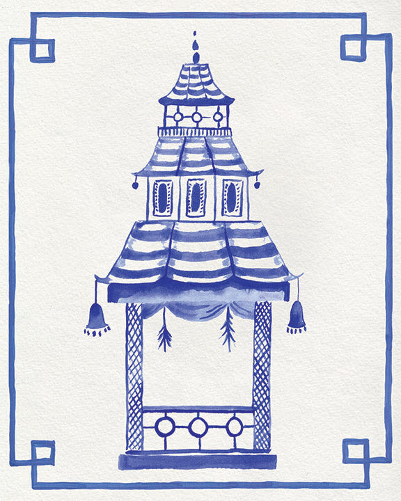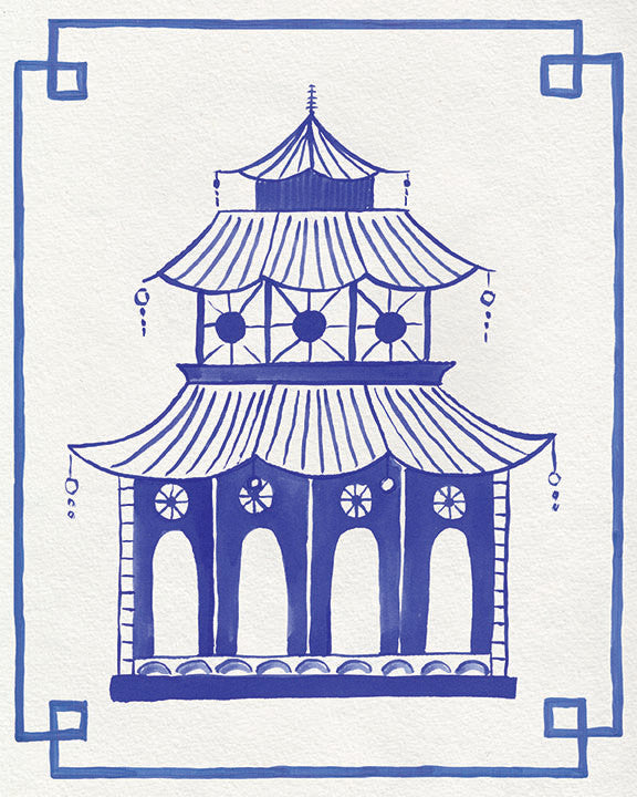 Bring home a modern take on elegant old-world Chinoiserie. This blue pagoda art print of an original, hand-painted acrylic and watercolor design will lend chic...