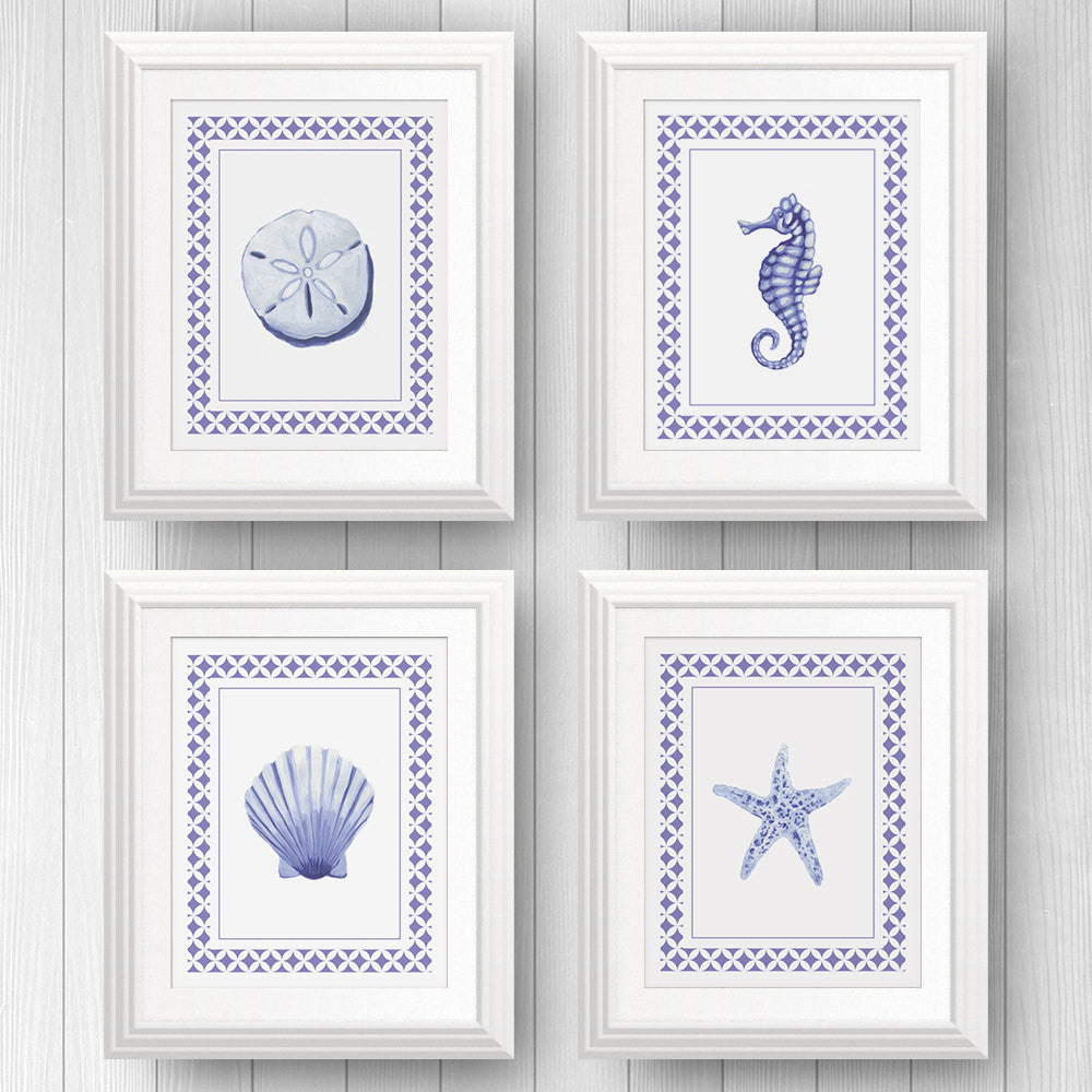 Bring home the beach with this beautiful blue sea life print set featuring seahorse, starfish, sand dollar and seashell fine art prints! These aquatic beach...